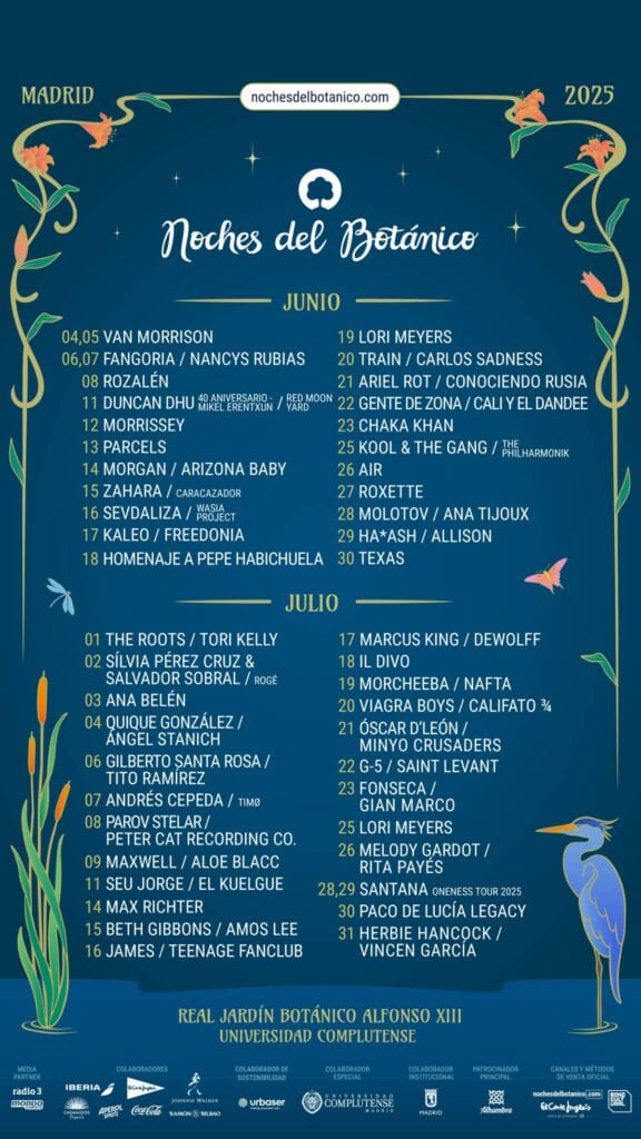 El Festival Noches del Botánico es un evento musical que se celebra anualmente durante los meses de verano en el Real Jardín Botánico Alfonso XIII de la Universidad Complutense de Madrid, España. Este festival se distingue por su programación diversa y de alta calidad, que abarca una amplia gama de géneros musicales, incluyendo rock, pop, jazz, flamenco, hip hop, y música electrónica, entre otros.