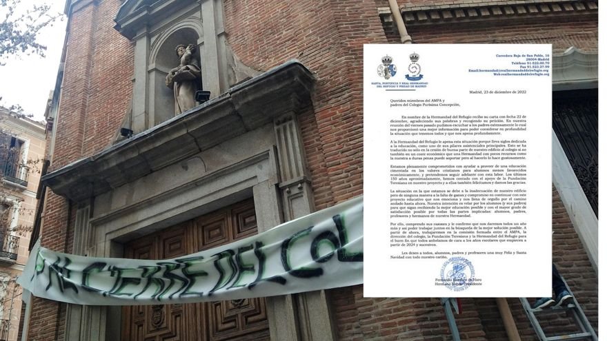 “Les confirmo que nos daremos todos un año más y así trabajar juntos en la búsqueda de la mejor solución posible (…) les deseo a todos, alumnos padres y profesores una muy Feliz y Santa Navidad con todo nuestro cariño”. Así acababa la carta con la que el hermano mayor y máximo dirigente de la Hermandad del Refugio, Fernando Ramírez de Haro, quería calmar los ánimos en las familias del colegio Purísima Concepción, indignadas al comunicarles que el centro escolar cerraría en junio de 2023 después de 300 años de funcionamiento en el barrio de Malasaña.