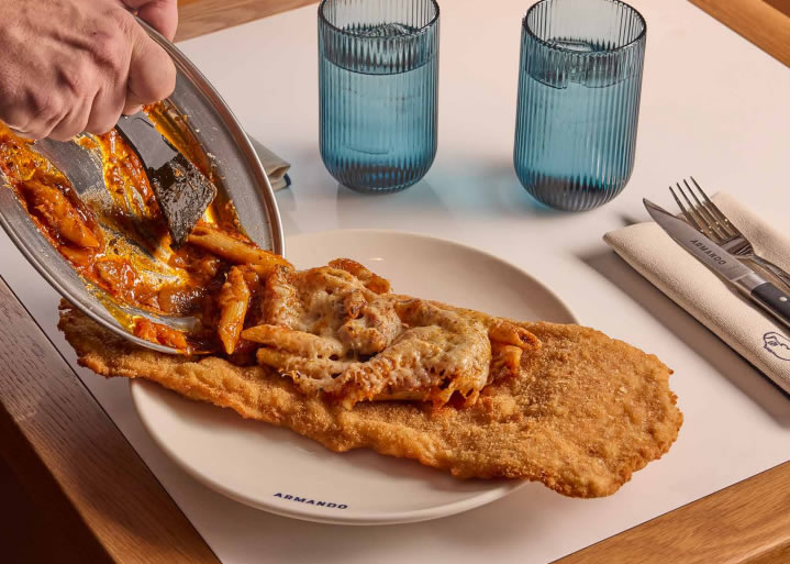 En Armando, además del escalope, se pueden disfrutar otras propuestas del grupo adaptadas al formato de comida a domicilio o para disfrutar en sala, manteniendo la calidad y tradición que distinguen a La Ancha.