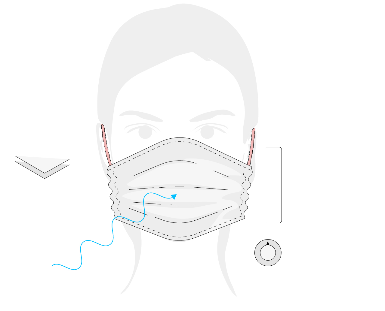 Tire suavemente de las cuerdas elásticas hasta que los nudos queden dentro del dobladillo. A continuación, junte los dos extremos de la máscara unidos por el elástico hasta ajustarlos al tamaño de su rostro y cosa el elástico a la tela para fijarlo.